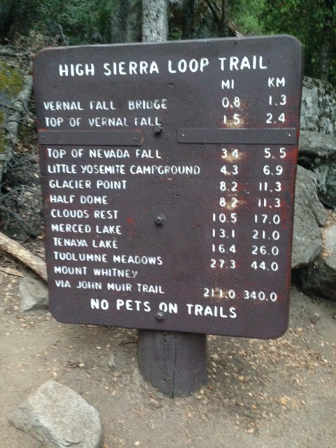 Basically, you start where it says “Happy Isles” over there on the left. I think it becomes painfully obvious from there.Let me just get this out of the way. If you’re in any way someone who only hikes intermittently along trails with gradually ascending terrain, then you can immediately dispense with any hallucinogenic notions about the hike “being about 8-10 hours.” Because it’s going to take you six to get up there. If you’re an inculcated cardio-hound with the ability to factor in altitude acclimation, you might do it–but why go to the top of Half Dome unless you’re going to kick it up there for at least an hour?