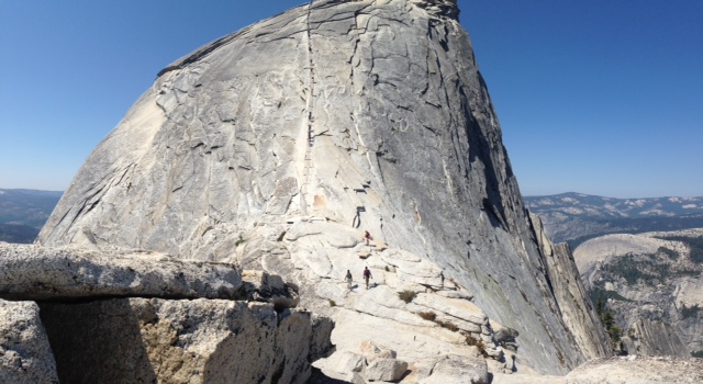 The next mile and a half feel pretty good, but the trees start to sparse out (you will, of course be leaving the tree line abruptly). Then–you will meet the accounting ranger at the base of what is known as “Sub Dome.” The cable route seems literally “right there.” It looks like all you need to do is walk around the corner and start climbing.