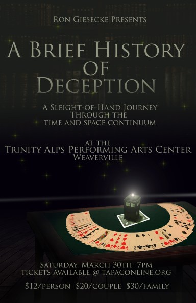 “This is why the word history is so prevalent in my show title,” he says. “because it covers brief glimpses into all of it; mine, magic, gambling, and world. Deception as a tool is like fire. In the wrong hands, it amounts to arson. In the right hands, it’s a warming agent with great illumination. My goal to represent the latter, and have the audience feel the journey was worth it.”